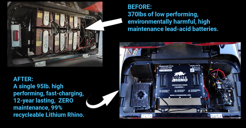 Drive faster, further, and longer in minutes with our 105Ah 48V Lithium Rhino conversion kit! Our 105ah delivers 5376Kw of power and an extended drive range of 50 miles on a single charge!